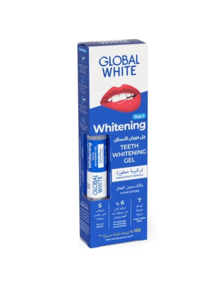 جلوبال وايت جل مبيض للأسنان هو تركيبة فعالة وآمنة لتبييض الأسنان وإزالة البقع, يحتوي على 6% من بيروكسيد الهيدروجين، وهو تركيز آمن للاستخدام المنزلي.الفوائد والمميزات:يزيل البقع الناتجة عن القهوة والشاي والتدخين .يمنح الاسنان بياضًا ولمعانًا فوريًا.يساعد على تقوية الأسنان وحمايته من التسوس.يساعد على محاربة البكتيريا المسببة لأمراض اللثة.تركيبة آمنة للاستخدام المنزلي.يبدأ تبييض الأسنان في الظهور خلال 7 أيام فقط.تبييض حتى 5 درجات.