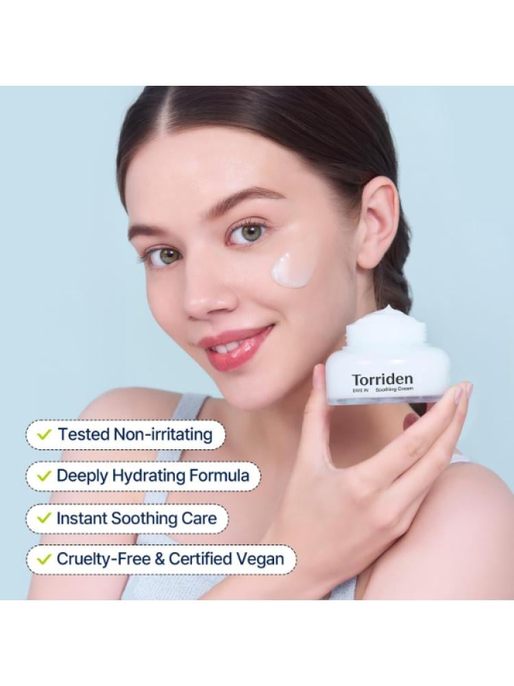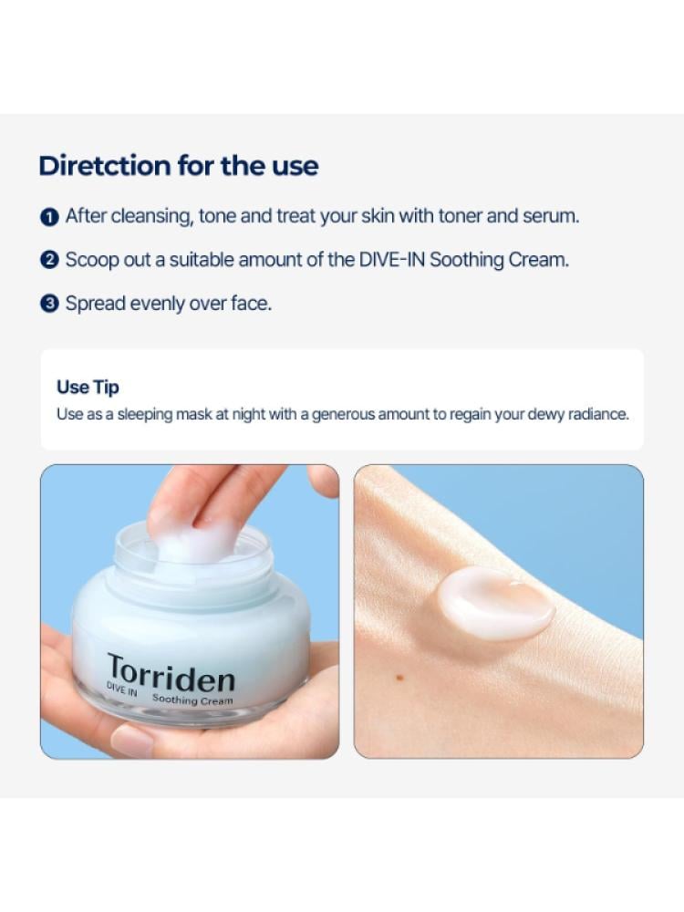 وداعاً للبشرة المجهدة والجافة، كريم توريدن دايف ان المهدئ هو الحل المثالي لغمر بشرتك بالترطيب العميق وتهدئتها فوراً، بفضل تركيبته الفريدة بحمض الهيالورونيك المتعدد.مميزات كريم توريدن دايف ان المهدئيوفر ترطيباً عميقاً ومستمراً بفضل 5 أنواع مختلفة من حمض الهيالورونيك التي تخترق طبقات الجلد المختلفة وتحبس الرطوبة بداخلها.يعمل على تهدئة البشرة الحساسة والمتهيجة بشكل فوري، ويقلل من الاحمرار والانزعاج بشكل ملحوظ بفضل مكوناته الملطفة.يتميز بقوام كريم جل مرطب خفيف ومنعش يمتصه الجلد بسرعة فائقة دون ترك أي ملمس لزج أو دهني.يساعد على تقوية حاجز البشرة الواقي والحفاظ على توازنها الصحي، مما يجعلها أكثر مقاومة للعوامل الخارجية.يعزز مرونة البشرة ويحسن ملمسها، مما يساهم في الحصول على بشرة ناعمة وممتلئة ونضرة.تركيبته اللطيفة تم اختبارها لتكون غير مهيجة ومناسبة لجميع أنواع البشرة، بما في ذلك البشرة المعرضة لحب الشباب.خالٍ تماماً من العطور الصناعية، البارابين، الكبريتات، والمواد الكيميائية القاسية التي قد تسبب تحسساً.يدعم عملية تجدد خلايا البشرة ويمنحها مظهراً صحياً ومتجدداً مع الاستخدام المنتظم.معلومات عن المنتجالعلامة التجارية: توريدان (Torriden)السلسلة: دايف إن (Dive-In)نوع المنتج: كريم جل مهدئ ومرطبالحجم: 50 مل (حجم شائع لهذا المنتج)المكونات الرئيسية: 5 أنواع حمض الهيالورونيك، مكونات مهدئة (مثل البانثينول، آلانتوين - مستنتج)مناسب لـ: جميع أنواع البشرة (الحساسة، الجافة، الدهنية، المختلطة، المعرضة لحب الشباب).خالٍ من: العطور الصناعية، البارابين، الكبريتات.مميزات إضافية: تم اختباره ليكون غير مهيج.طريقة الاستخدامفي الخطوة الأخيرة من روتين العناية بالبشرة (بعد السيروم).ضعي كمية مناسبة من الكريم على الوجه والرقبة.دلكي بلطف أو ربتي بأطراف الأصابع لتعزيز الامتصاص. يستخدم صباحاً ومساءً.امنحي بشرتكِ جرعة يومية من الراحة والترطيب العميق مع هذا الكريم المهدئ. اكتشفي سحر العناية الكورية الفعالة ضمن مجموعة العناية بالوجه لدينا، وجربي استكماله بسيرومات متخصصة من تشكيلة مرطبات الوجه للحصول على أفضل النتائج.