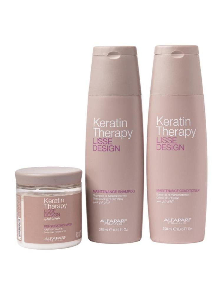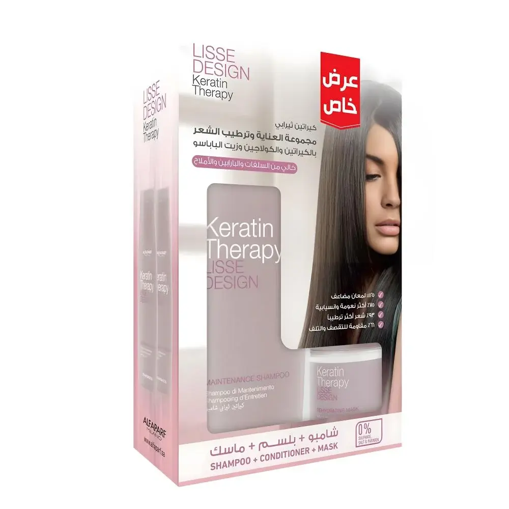 تحتوي المجموعة على كيراتين ثيرابي شامبو وبلسم وماسك غني بالكيراتين، يساعد على تقوية الشعر وتقليل الهيشان ومنحه مظهراً صحياً ولامعاً من أول استخدام.
