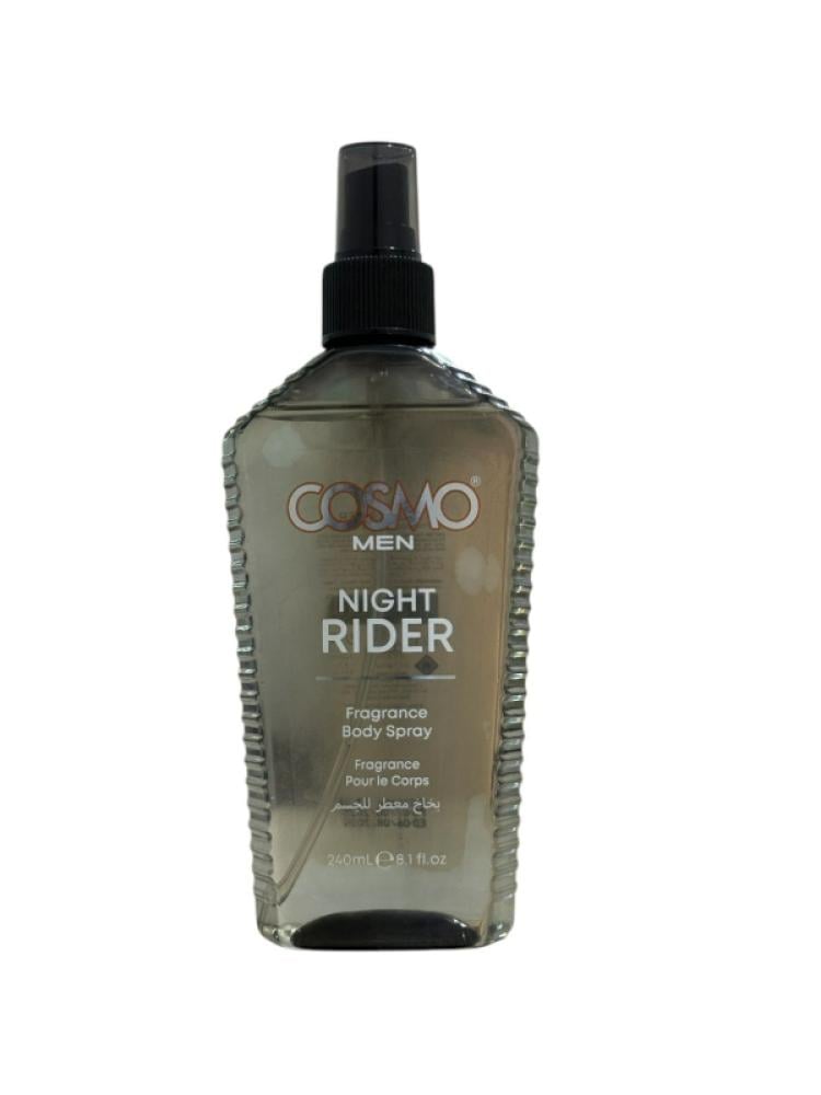 امنح يومك بداية قوية مع رذاذ الجسم الرجالي نايت رايدر من كوزمو، المصمم ليمنحك انتعاشًا يدوم طوال اليوم برائحة ذكورية أنيقة وجذابة.مميزات المنتج:بخاخ م...