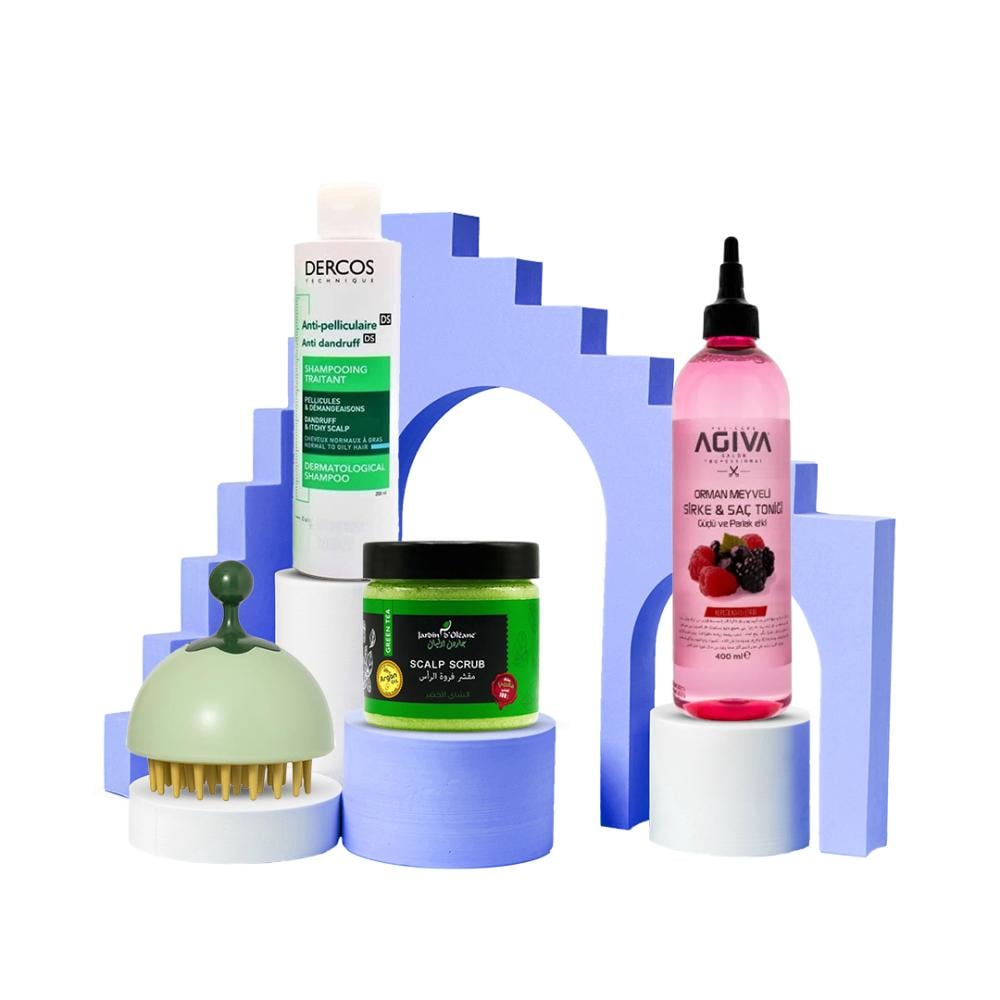 احصلي على فروة رأس صحية وشعر نظيف ولامع مع هذا البكج المتكامل الذي يجمع بين أقوى المنتجات المختصة في محاربة القشرة وتهدئة الحكة وتقوية الشعر.محتويات ا...