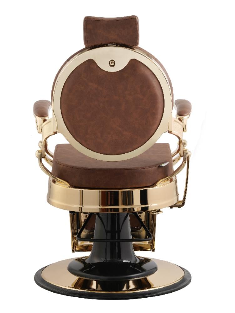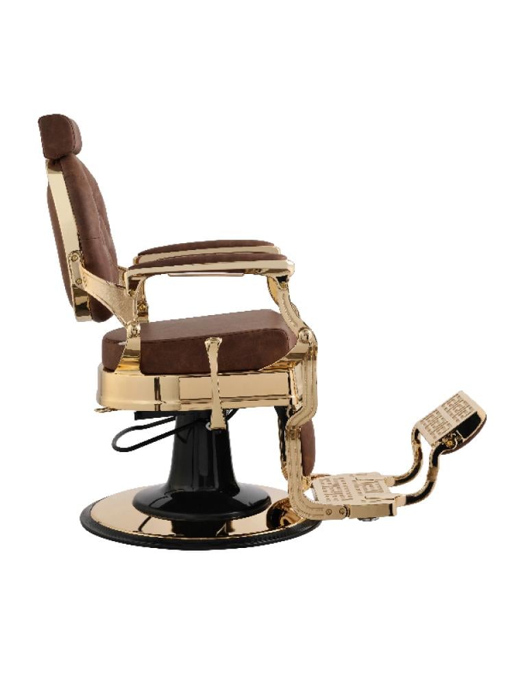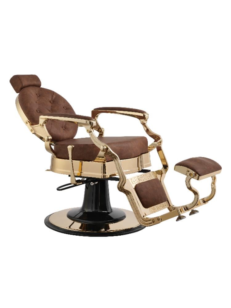 اليغانت بريميوم كرسي حلاقة رجالي من صالون سيستم مصنوع من مزيج من المعدن المطلي بالذهب والجلد الصناعي البني. يرتكز على قاعدة دائرية باللون الأسود والذهبي. يحتوي على مساند للذراعين ومسند للرأس مبطن. يمكن إمالة مسند الظهر للخلف بشكل كبير، كما يحتوي على مسند للقدمين قابل للتعديل يتصل بالهيكل الرئيسي للكرسي، مما يوفر دعمًا كاملاً للعميل. بشكل عام، هو كرسي حلاقة يعكس الفخامة والجودة العالية.