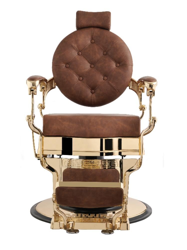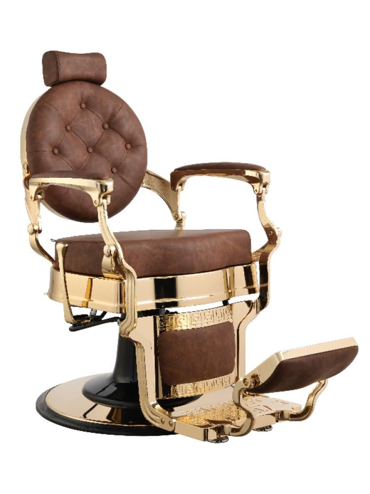 كرسي حلاقة فاخر، يتميز بتصميم كلاسيكي قديم يعود إلى حقبة زمنية سابقة، ولكنه مزود بتقنيات حديثة لضمان الراحة والوظيفة. إنه قطعة أثاث مميزة تضيف لمسة من الفخامة والأناقة إلى أي صالون حلاقة.