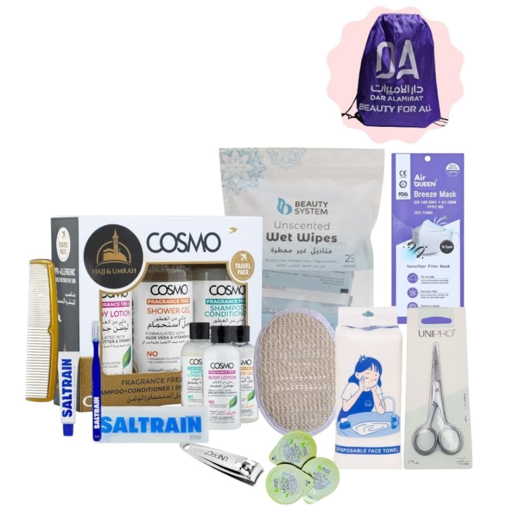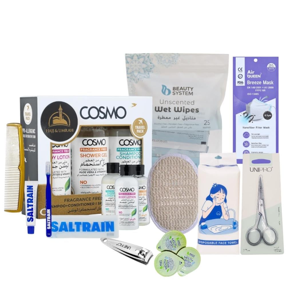 نقدم لك الحل المثالي لرحلة حج أو عمرة مريحة وآمنة — مجموعة العناية الشخصية المتكاملة التي تضم كافة الاحتياجات الأساسية للنظافة والعناية أثناء أداء الشعائر، صُممت بعناية لتكون خالية من العطور، سهلة الحمل، وعملية في كل تنقل.محتويات المجموعة:نظافة فائقة للاستخدام الواحدمناشف وجه ناعمة من يويو سوفت – 100 حبة (20×20 سم) : للاستعمال مرة واحدة، مثالية للتجفيف والنظافة أثناء الوضوء أو الاستحمام.عناية بالفم أثناء السفرطقم الفم من سالترين معجون أسنان طبيعي بملح رمادي مع فرشاة مدمجة – حجم السفر (30 جم / أزرق) : للمحافظة على نظافة الفم والانتعاش أثناء التنقل.غسول فم من بيوتي سيستم (3 كبسولات) : بنكهة النعناع المنعشة، يمنحك انتعاشًا فوريًا وراحة تدوم.نظافة وترطيب لطيفمجموعة كوزمو للحج والعمرة – 300 مل : تركيبة خالية من العطور تشمل: شامبو، بلسم، جل استحمام، ولوشن للجسم — لطيفة وآمنة للبشرة أثناء أداء المناسك.مستلزمات ضرورية وعمليةليفة استحمام فندقية للاستخدام مرة واحدة - 3 قطع : لتنظيف فعال وآمن للبشرة دون الحاجة لحمل أدوات استحمام متعددة.مقص شارب ولحية من يوني برو : تصميم دقيق لضبط الشارب واللحية بأمان وسهولة.مشط بني للاستخدام الواحد : خفيف وعملي للاستخدام السريع أثناء التنقل.مقص أظافر فضي – يوني برو : عالي الجودة للعناية الدقيقة بالأظافر.مناديل غير معطرة من بيوتي سيستم (25 منديل) : مثالية للاستخدام اليومي والنظافة الشخصية أثناء التنقل.كمامة إير كوين – أبيض : للحماية الشخصية والراحة في الأماكن المزدحمة.حقيبة ظهر مجانية: متين وعملي لحمل مستلزماتك بسهولة وراحة أثناء تنقلاتك في المشاعر المقدسة.مزايا المجموعة:خالية من العطور – مثالية للأماكن المقدسة.سهلة الحمل والتنظيم.أدوات استخدام واحد لضمان النظافة.جودة عالية بعناية مدروسة لتلائم ظروف الحج والعمرة.رفيقك المثالي في رحلتك الإيمانية – اجعل تجربتك أكثر راحة ونظافة مع هذه المجموعة الشاملة التي تجمع بين الجودة، العملية، واحتياجاتك الأساسية في مكان واحد.