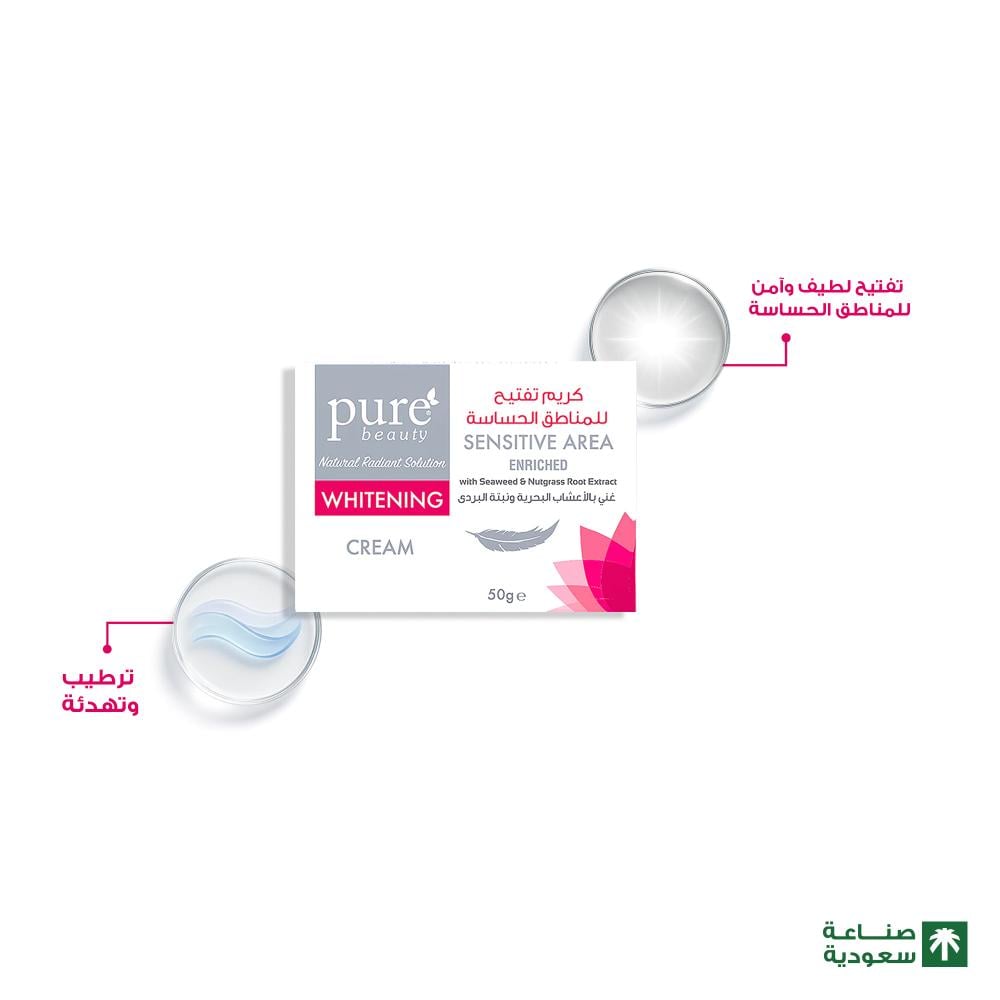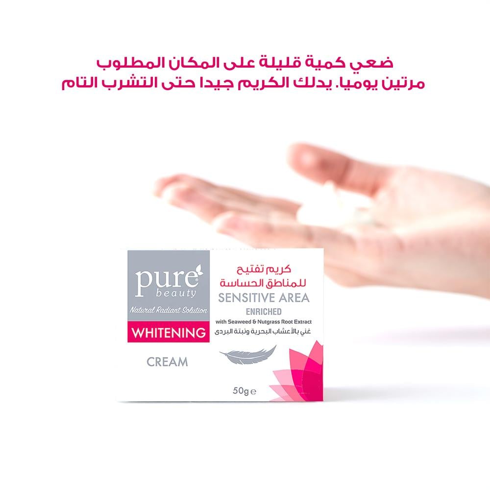 احصلي على لون بشرة متجانس وثقة تامة مع كريم تفتيح المناطق الحساسة من بيور بيوتي. بتركيبته الغنية بالمستخلصات الطبيعية، يعمل هذا الكريم بفعالية وأمان عاليين على تفتيح التصبغات في المناطق الحساسة، مع توفير ترطيب مكثف يترك بشرتكِ ناعمة كالحرير.