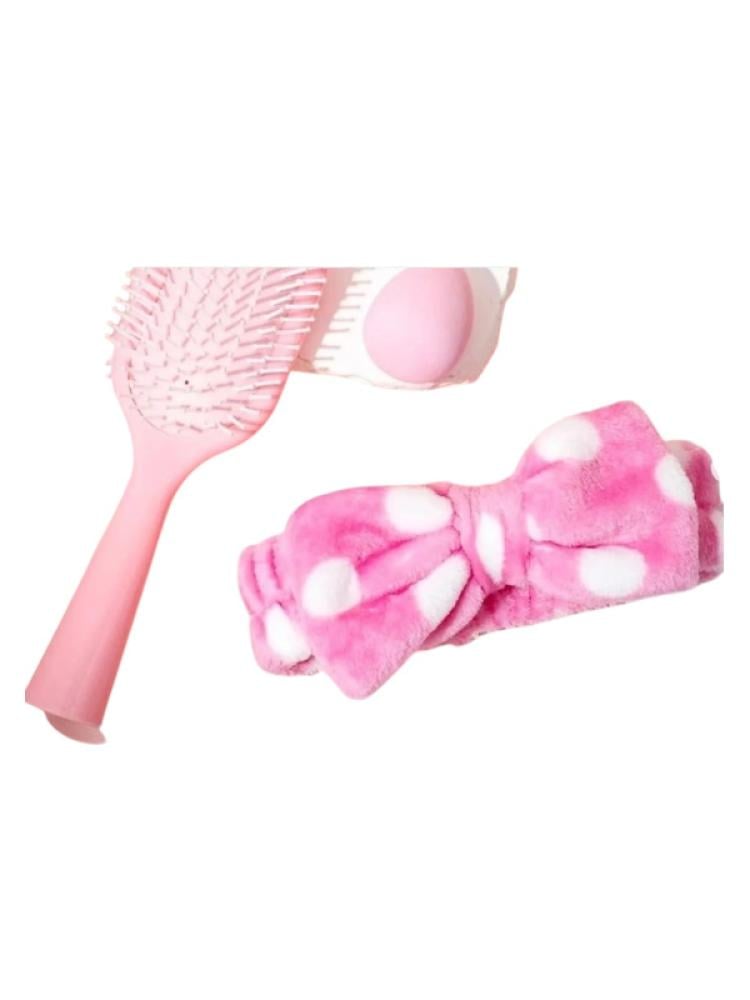 مجموعة عناية شخصية مرحة ومناسبة للفتيات، تأتي في عبوة وردية جذابة.مكونات المجموعة:فرشاة شعر احترافية: فرشاة تدليك أو فك تشابك بتصميم بلاستيكي بلون زهري ، تتميز بشعيرات مرنة لتمشيط الشعر بلطف.ربطة رأس ناعمة وفروية: بتصميم عقدة ولون زهري ومنقوشة بنمط الفهد/القلوب باللون الابيض, وتُستخدم عادة لربط الشعر أثناء تطبيق العناية بالبشرة أو المكياج..إسفنجة مكياج : لتطبيق وتوزيع المكياج علي الوجه بدقة.المزايا:لون جذاب: تأتي بألوان متنوعة و جميلة.حمل مريح: سهلة الحمل والتعليق.مثالية للسفر: حجمها مناسب وتناسب حقائب السفر الكبيرة أو حقائب اليد.التغليف: تأتي في صندوق جذاب مُصمم كـ مجموعة مكياج احترافية، مما يجعلها خياراً جيداً كهدية.