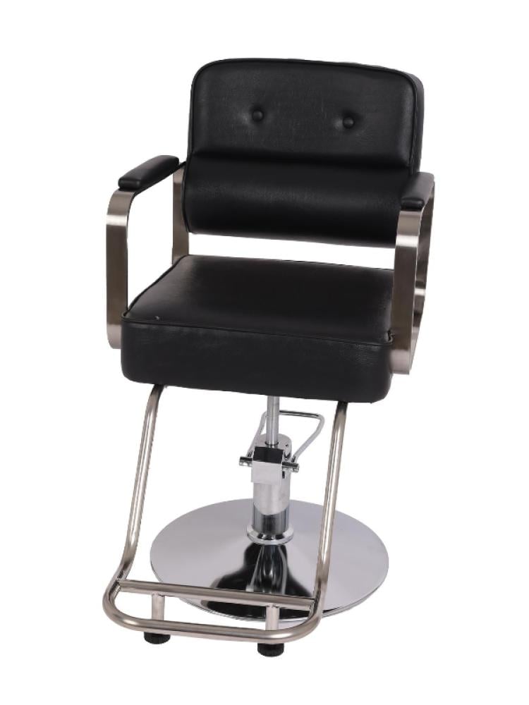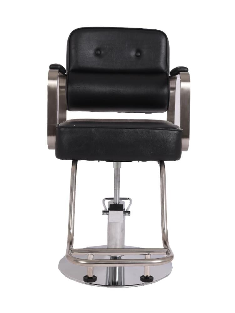 تصميم أنيق وعصري يتميز بقطعة ظهر وسند ذراعين مبطنة بالجلد الصناعي الأسود، مع قاعدة هيدروليكية دائرية تدعم الدوران بزاوية 360°، ما يجعله مثاليًا لإنشاء جو احترافي في صالون التجميل أو ورشة التصفيف.الأبعاد:ارتفاع: 105 سمعرض: 53 سمعمق: 53 سمالمزايا:هيدروليك قابل للتعديل ودوّار 360°: مزود بمضخة هيدروليكية قوية تتحكم بارتفاع الكرسي بسهولة عبر دواسة القدم، مع إمكانية دوران كاملة تسهل على المصمم الوصول من جميع الجوانب دون إعادة ضبط الكرسي .مقعد ومساند مريحة ومبطنة: تنجيد من الجلد الصناعي الفاخر مع إسفنج عالي الكثافة يوفّر توزيعًا متوازنًا للوزن ودعمًا للظهر خلال جلسات طويلة، محققًا راحة مثالية للعميل .قاعدة معدنية قوية ومستقرة: القاعدة الدائرية المعدنية (كروم أو فولاذ مقاوم للصدأ) تضمن ثباتًا ممتازًا وتحمل أوزان حتى 150–200 كجم، مع جرد مطاطي لحماية الأرضيات ومنع الانزلاق .تصميم عملي وميزات احترافية إضافية: تشمل مسندًا للقدم لتعزيز راحة العميل، وتفاصيل جميلة مثل الحواف المستديرة المفتوحة التي تضيف لمسة تصميمية متقنة وعملية لصيانة أسهل .إذا كنتِ تبحثين عن كراسي صالونات نسائية تجمع بين الراحة والعملية والمظهر العصري، فهذا الطراز الأسود الهادئ هو الخيار الأمثل. يتمتع بقاعدة هيدروليكية قابلة للتعديل والدوران، وتنفيذ هندسي دقيق يجمع بين الجلد الصناعي، القاعدة المعدنية القوية، والمساند المريحة. إنه استثمار مثالي لأي صالون يسعى لتقديم تجربة فاخرة لعملائه.