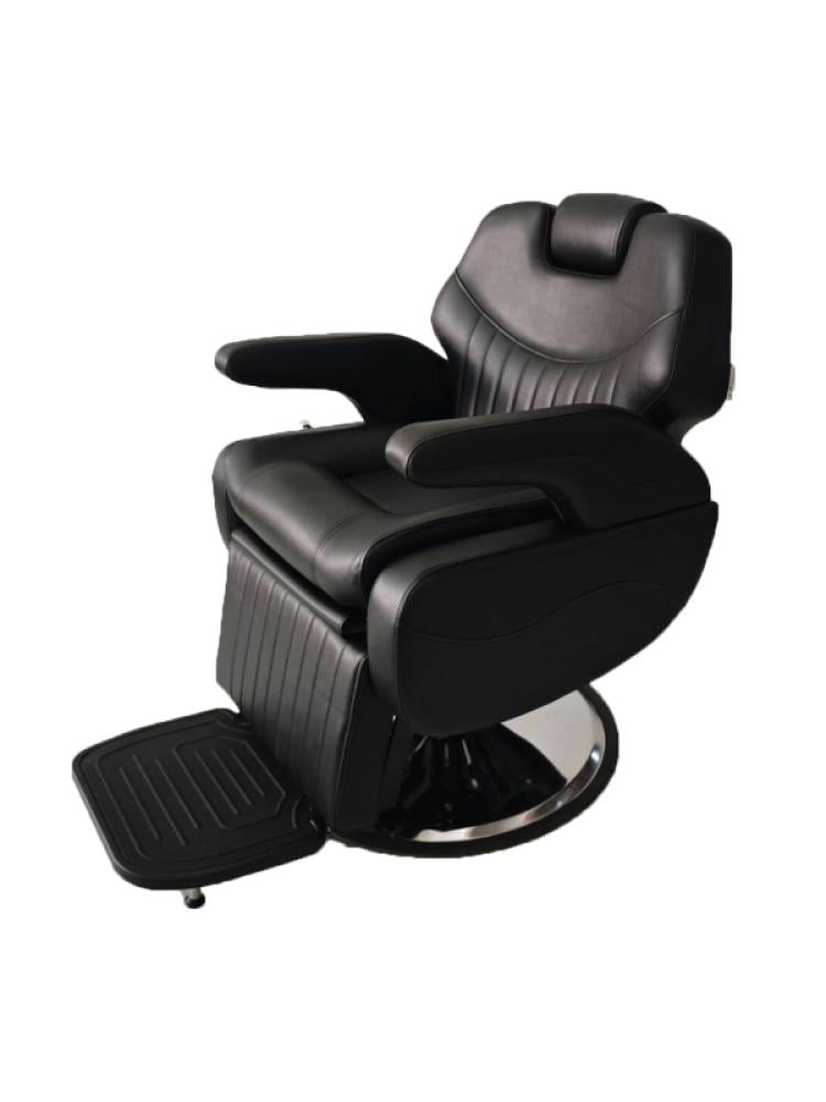 كرسي حلاقة رجالي فاخر بتصميم كلاسيكي ومريح، مثالي لصالونات الحلاقة الراقية أو مراكز العناية بالرجل.المزايا الرئيسية:الجودة والتصميم: تنجيد فاخر : مغطى بجلد صناعي أسود عالي الجودة ومبطن بشكل كثيف لتوفير أقصى درجات الراحة.تصميم مريح: يتميز بمسند للرأس قابل للتعديل، ومقعد واسع، ومساند مبطنة للذراعين.متانة عالية: قاعدة دائرية عريضة من الكروم أو الفولاذ المصقول تضمن ثبات الكرسي وقوته.الوظائف والتحكم:قابلية الإمالة : يمكن إمالة ظهر الكرسي بشكل كامل أو شبه كامل لجعله مناسباً لخدمات الحلاقة، واللحية، والعناية بالوجه.مسند للقدمين: يحتوي على مسند للقدمين مدمج وقابل للتعديل، مع وجود منصة متينة وواسعة لوضع القدمين براحة.آلية الرفع: يعتمد على نظام هيدروليكي للتحكم في ارتفاع الكرسي بسهولة.اللون: أسود بالكامل، وهو لون كلاسيكي يضيف لمسة من الأناقة الاحترافية للمكان.إنه كرسي عملي وجمالي يوفر للعميل تجربة جلوس مريحة وفاخرة أثناء تقديم خدمات الصالون المختلفة.