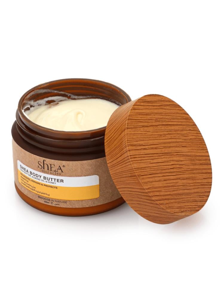 زبدة الشيا للجسم من شيا ميراكلز!المزايا:زبدة للجسم بزبدة الشيا وزيت اللوز وخلاصة العسل تمنحك بشرة ناعمة من شيا ميراكلز.تعمل على تغذية البشرة وتعالجها وتحميها لتحصلي على بشرة بمظهر صحي و بملمس حريري.هذا المزيج المميز لهذه المكونات الثلاثية تجعل الزبدة تمتص وتذوب بسرعة تمنح البشرة النعومة الفائقة.تعمل زبدة الشيا وزيت اللوز الغني بفيتامين E والمعادن والبروتينات على تغذية بشرتك بعمق وتحميها من الإجهاد التأكسدي والبيئة.كما يعمل العسل كمرطب طبيعي وقوي وحامي للبشرة ويمنحها النعومة والرطوبة اللازمة تدوم لوقت طويل.مناسب للبشرة الجافة وشديدة الحساسية.الزبدة المثالية لبشرة جميلة وناعمة كالحرير.