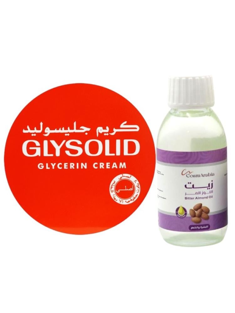 دللي نفسك مع خلطة ثنائي التفتيح – كريم + زيت، لبشرة ناعمة ومشرقة بكل إشراقة الطبيعة!محتويات المجموعة:كريم جليسوليد 175 مل – يرطب البشرة بعمق ويحسن مرونتها مع حماية من التصبغات والأضرار البيئية.زيت اللوز المر للبشرة من كوزماريبيا 125 مل – تركيبة نقية تمنح البشرة إشراقًا وتغذية طبيعية.المميزات والفوائد:يوحّد لون البشرة ويقلل من ظهور البقع الداكنة والتصبغات.يرطب البشرة بفعالية ويعيد لها النضارة والإشراق الطبيعي.يحمي البشرة من التجاعيد والخطوط الدقيقة وعلامات الشيخوخة المبكرة.يغذي البشرة والشعر بمكونات طبيعية آمنة وفعالة.يمنح البشرة شعورًا بالنعومة والراحة ويجعلها أكثر صحة وحيوية.طريقة الاستخدام للجسم:امزجي كمية مناسبة من كريم جليسوليد مع زيت اللوز المر .ضعي الخلطة على البشرة ودلّكيها بحركات دائرية حتى تمتصها البشرة بالكامل.يمكن ترك الخلطة على البشرة دون شطف لزيادة الترطيب والإشراق الطبيعي.استخدميها يوميًا للحصول على أفضل النتائج في توحيد لون البشرة خلطة ثنائي التفتيح – السر الطبيعي لبشرة متوهجة وناعمة، يمنحك إشراقة صحية ورعاية كاملة من الرأس حتى القدمين.