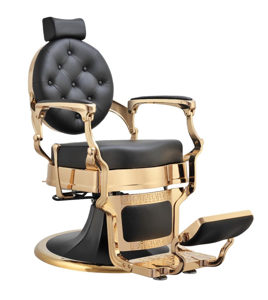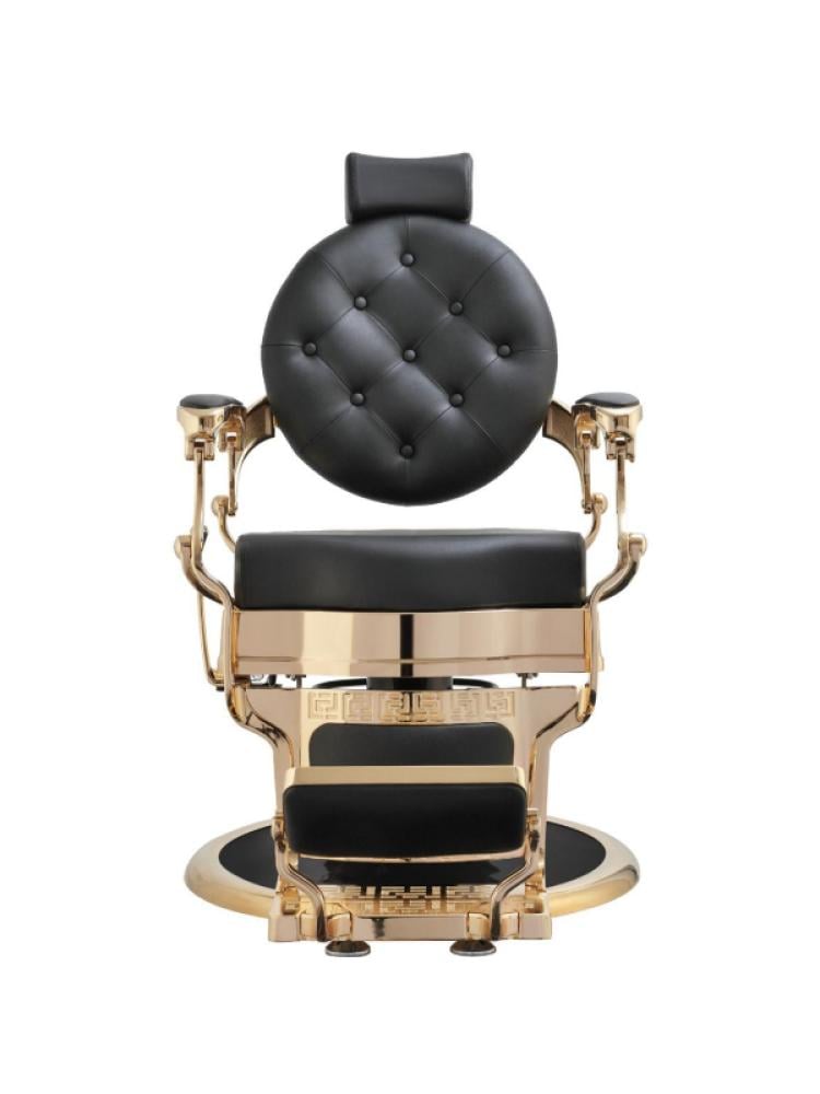 Luxury Barber Chair with Classic Modern DesignEnjoy a royal shaving experience with this luxury barber chair. Combining classic elegance with a modern touch, this chair is the perfect addition to any modern barbershop.Features:Stylish Design: The chair features an attractive design with a shiny gold base and luxurious black leather upholstery with quilted embellishments.Ultra Comfort: The chair provides maximum comfort for your clients with its high backrest and comfortable cushion.Adjustable: The chair can be easily adjusted to suit the client’s height and preferred angle, ensuring a comfortable experience for both the client and the barber.High Durability: Made from high-quality materials that ensure durability and longevity.Easy to Clean: The chair can be easily cleaned to maintain its elegant appearance.Specifications:Material: Premium faux leather, gold-plated metal base.Color: Black and gold.Uses:Ideal for men’s barbershops.Can be used at home for those who want a professional shaving experience.A stylish addition to any space.Benefits of Buying:Attract Clients: This elegant chair will attract clients to your salon and help you build a good reputation.IMPROVED CLIENT EXPERIENCE: The chair provides a comfortable and enjoyable shaving experience for your clients.Long-term investment: High-quality construction ensures a long life for the chair.Invest in the comfort of your clients and the beauty of your salon with this luxurious chair.