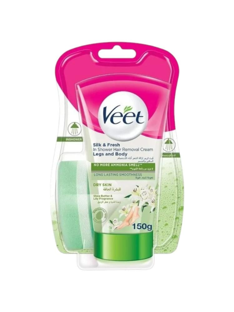 Get long-lasting smoothness with Veet In-Shower Hair Removal Cream, specially formulated for dry skin. Its unique formula contains shea butter and a delicate night fragrance, providing effective hair removal without irritation and long-lasting moisture.Benefits:Use in the shower for comfort and ease.Enriched with shea butter to deeply moisturize dry skin.The refreshing night fragrance provides a pleasant care experience.Free from the irritating ammonia smell.Long-lasting results and visible smoothness from the first use.150g pack is sufficient for multiple uses.Directions:Apply an even layer to dry skin, wait 5-10 minutes, then gently rinse in the shower using the included sponge.Veet Cream – Smoothness starts in the shower!