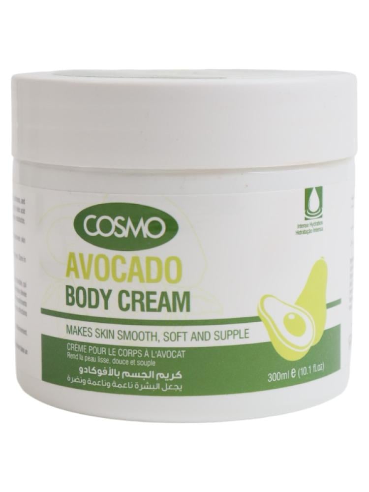 Cosmo Avocado Hydrating Body Cream (300 ml) is the perfect product for deeply moisturizing and nourishing the skin. Enriched with avocado oil, this cream provides the skin with the care it needs, leaving it soft, supple, and with a healthy, natural glow.Features:Deep Hydration: The cream offers long-lasting moisture, helping to keep the skin soft and glowing throughout the day.Rich in Avocado Oil: Contains fatty acids such as oleic and palmitic acid, which nourish the skin and improve its elasticity.Antioxidants: High in antioxidants that help repair and soothe the skin while protecting it from harmful environmental factors.Quick Absorption: The light formula is rapidly absorbed by the skin without leaving any greasy residue.Suitable for All Skin Types: Ideal for dry and normal skin, improving texture and flexibility.Economical Size: The 300 ml packaging offers long-lasting use, providing great value.With Cosmo Avocado Hydrating Body Cream, enjoy long-lasting hydration and noticeable smoothness throughout the day.