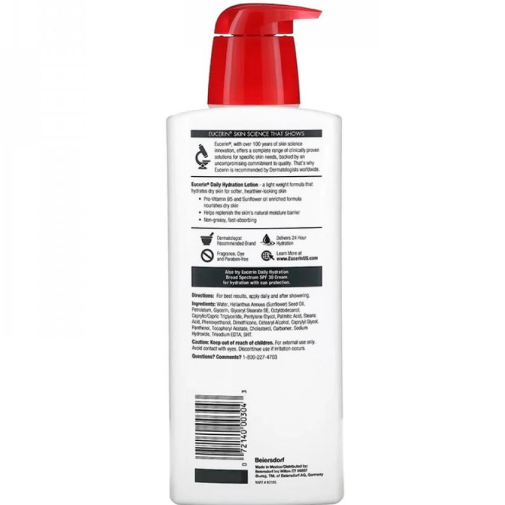 Pamper yourself with deep hydrationDaily moisturizing lotion for dry skin from Eucerin. The lotion is characterized by its light, creamy texture that absorbs quickly and leaves the skin soft and smooth.This daily moisturizing lotion for dry skin features?24-hour deep hydration: Nourishes dry skin and helps restore its natural balance for 24-hour hydration.Light, non-greasy formula: The lotion glides easily on the skin without leaving any greasy or sticky feeling.Suitable for sensitive skin: Dermatologically tested and free of fragrances, dyes and parabens, making it suitable for sensitive skin.Enriched with vitamins and nutrients: Enriched with a combination of vitamin B5 and sunflower oil, it helps nourish and protect the skin.The most important effective ingredients of moisturizing lotion!!Vitamin B5: Helps moisturize the skin and protect it from dryness.Sunflower oil: Rich in antioxidants that protect the skin from free radicals.How to use daily moisturizing lotion for dry skin?For best results, apply daily after bath or shower.Massage the lotion onto your skin in circular motions until it is completely absorbed.You can also use on your hands and feet.Get radiant and vibrant skin with Eucerin Daily Moisturizing Lotion for Dry Skin, from your favorite store, Dar Al Amirat.
