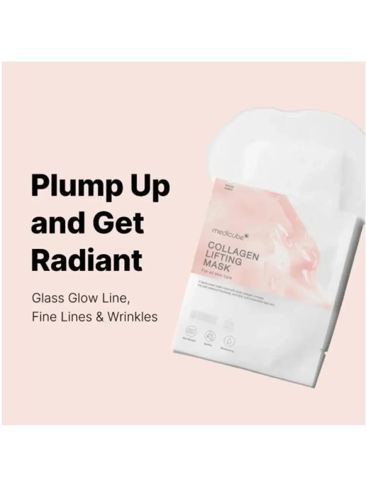 The Medicube Collagen Lifting Mask (27g) is a premium Korean sheet mask designed to enhance skin elasticity, deeply hydrate, and promote a youthful glow. Infused with a potent blend of collagen types and botanical extracts, it offers a comprehensive solution for those seeking firmer, more radiant skin.Benefits:Enhanced Firmness & Elasticity: The Triple Collagen Complex works synergistically to improve skin's firmness and reduce the appearance of fine lines.Deep Hydration: The Hyaluronic Acid Complex ensures that moisture is retained within the skin, leaving it plump and refreshed.Soothing & Calming: Allantoin and Panthenol help to soothe irritated skin, making the mask suitable for sensitive skin types.Brightened Complexion: Botanical extracts contribute to a more luminous and even skin tone.The Medicube Collagen Lifting Mask stands out as an effective solution for those aiming to rejuvenate their skin. With its rich blend of collagen, hydrating agents, and botanical extracts, it delivers noticeable improvements in skin texture, firmness, and radiance. Suitable for all skin types, including sensitive skin, this mask is a valuable addition to any skincare routine.