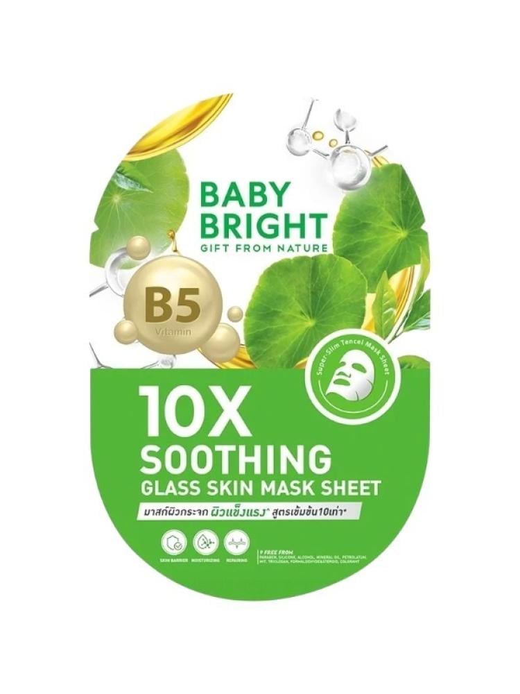 Enhance the health and radiance of your skin with the 10X Soothing and Intensive Hydration Glass Skin Mask from Baby Bright, providing deep moisture and leaving your skin naturally luminous and healthy.Key Active Ingredients:Ceramides and panthenol with 8 types of hyaluronic acid for intensive hydration and plump, soft skin.Centella Asiatica extract for antioxidant protection, soothing, and improving skin elasticity.Tea tree oil and green tea extract to purify pores and regulate excess oil.Features & Benefits:Strengthens the skin barrier and maintains natural hydration.Soothes sensitive skin and reduces irritation.Reduces wrinkles and fine lines for visibly smoother skin.Helps control excess oil and purify pores.Gives the skin a healthy glow and revitalized appearance.How to Use:After cleansing your face, gently apply the mask to the skin.Leave it on for 15–20 minutes for full nourishment and hydration.Remove the mask and gently massage any remaining serum into the skin until fully absorbed.Use 2–3 times per week for optimal results.Choose the 10X Soothing Glass Skin Mask from Baby Bright for strong, radiant, and soft skin with a healthy glow that lasts all day.