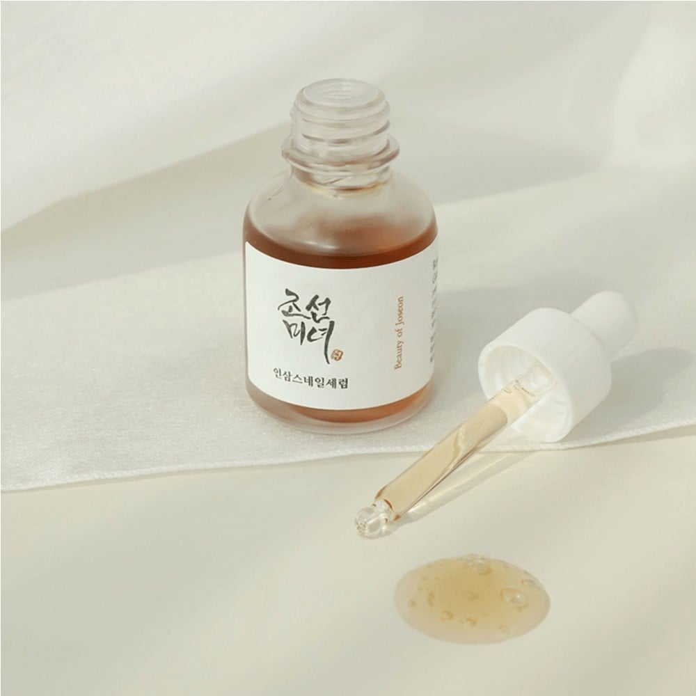Discover the power of snail serum, which contains natural ingredients that help reduce the appearance of wrinkles and even out skin tone. Beauty of Joseon Ginseng & Snail Renewal Serum - 30ml is the magic solution for flawless skin. Features of snail serum:Contains ginseng extract that nourishes the skin and improves its elasticity.A lightweight formula enriched with natural hanbang ingredients, it gives your skin all-day moisture.Ginseng helps reduce the appearance of fine lines and wrinkles, giving you a youthful appearance.Snails regenerate skin cells and even out skin tone, reducing pigmentation and dark spots.It helps tighten the skin and protect it from harmful external factors.Suitable for all skin types.Made in Korea.Enjoy vibrant, beautiful skin with this serum, the ultimate facial moisturizer. Order it now from Dar Al Amirah and discover the difference.the components :Panax ginseng root water.Butylene glycol.1,2-Hexanediol.Snail secretion filter.Dipropylene glycol.water.Niacinamide.Glycerin.Propanediol.Trehalose.Xanthan gum.Glycereth-25 PCA Isostearate.Glyceryl acrylate/acrylic acid copolymer.Ethylhexylglycerin.Carbomer.Adenosine.Theobroma cacao (cocoa) seed extract.Tricholoma matsutake extract.Tromethamine.Rhododendron chrysanthemum leaf extract.Disodium EDTA.Hydrolyzed Cicerone Seed Extract.Hyaluronic acid.Hydrolyzed hyaluronic acid.Dextrin.Sodium hyaluronate.Phyllinus linteus extract.Cornus officinalis fruit extract.Glycyrrhizae glabra (licorice) root extract.Akebia quinata extract.Panax ginseng root extract.