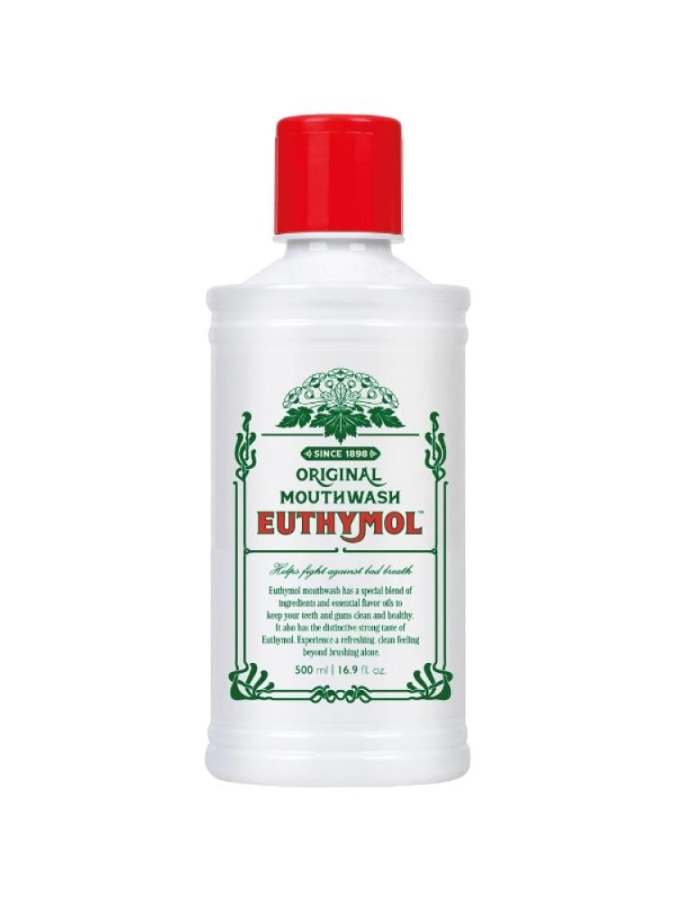 Discover true freshness with Euthymol Original Mouthwash – 500 ml.A unique formula that combines effective ingredients and natural essential oils to deeply cleanse your mouth and give you long-lasting fresh breath.Benefits:Effectively helps combat bad breath.Contains essential oils that support healthy gums and teeth.Leaves a refreshing, clean feeling that brushing alone can't achieve.Features Euthymol’s strong, distinctive flavor for unforgettable oral care.Reduces plaque buildup and promotes oral health.Maintains the mouth’s natural balance without causing dryness or irritation.How to Use:Pour 10 ml (one capful) of the mouthwash.Rinse for 30–60 seconds, then spit out.Use morning and evening after brushing.Do not swallow. Not suitable for children under 12 years old.Complete your daily oral care routine with a confident smile and long-lasting freshness – only with Euthymol.