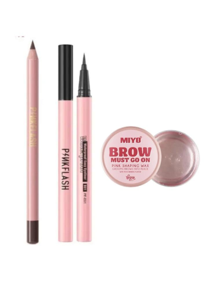 Achieve glamorous eyes and perfect brows with this all-in-one kit from Pink Flash and Miu. Each piece is designed to provide long-lasting hold, precision, and elegance, so you can enjoy a natural, radiant beauty all day long.Kit Features:Pink Flash Waterproof Eyebrow Pencil 03: Provides natural, precise definition with long-lasting hold.Pink Flash Waterproof Eyeliner (B01): Intense, long-lasting black to highlight the beauty of the eyes with a strong, feminine touch.Miu Brow Must Go On Wax - Sheer Pink (30g): Perfectly sets brows with a light, natural finish.Kit Benefits:Waterproof hold for all occasions.Comfortable formula that doesn't clump or smudge.Easy to use for both beginners and professionals.Gives you a complete eye and brow look in just a few simple steps.With the 3-piece Eye and Brow Kit, you'll find everything you need to define your brows, highlight your eyes, and set your elegant look all day long.Order it now from Dar Al Amirat to complete your beauty look with easy steps and amazing results.