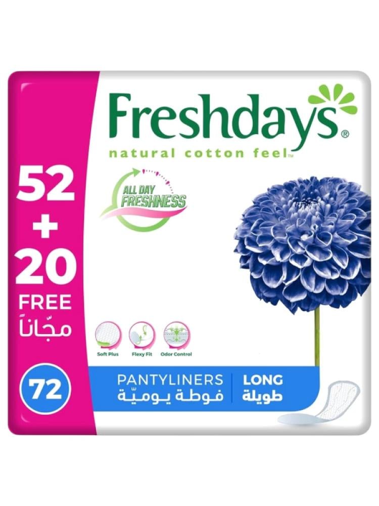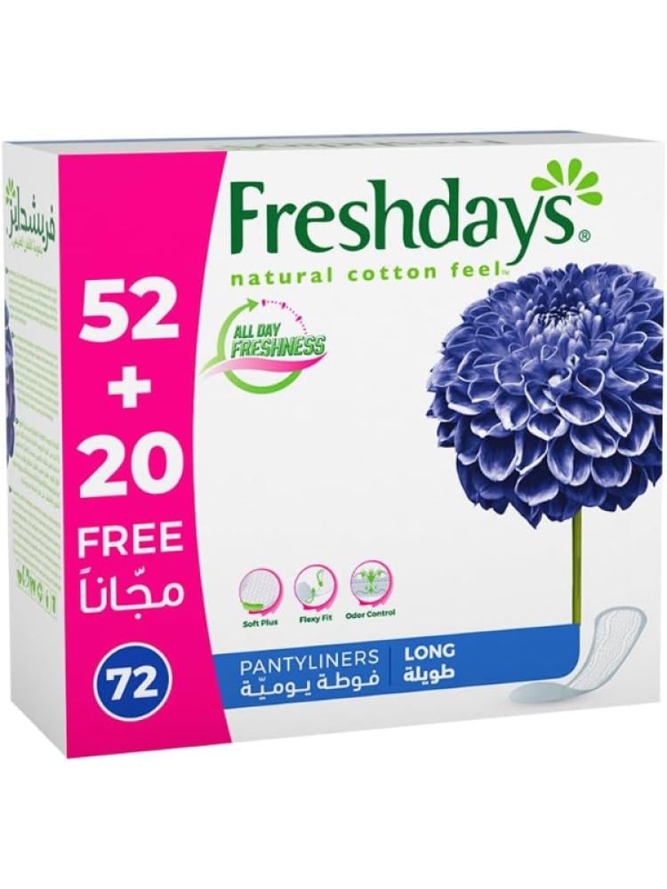 Stay fresh and confident all day long with Freshdays Long Daily Pantyliners, designed a natural cotton fee to provide exceptional comfort and optimal absorption.Features:Natural Cotton Feel: Gentle on the skin and offers long-lasting comfort.Long Design: Covers a wider area for extra protection.Soft Plus Technology: Ultra-soft top layer for maximum comfort.Flexy Fit: Adapts to your body’s movement for all-day wear.Odor Control: Helps prevent unwanted odors, keeping you fresh at all times.For Daily Use: Perfect for maintaining hygiene and freshness on regular days or as extra support during your period.Quantity:72 pantyliners (52 + 20 FREE)Freshdays... All-day freshness you can trust!