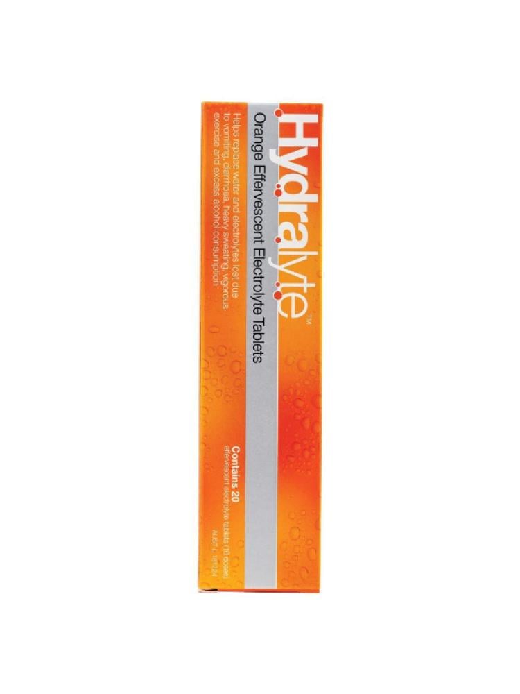 Hydralyte Orange-Flavored Effervescent Electrolyte Tablets are designed for rapid rehydration following fluid and electrolyte loss due to diarrhea, vomiting, heavy sweating, or exercise. These tablets are gluten-free, free from artificial colors and preservatives, and formulated according to WHO guidelines for immediate rehydrationBenefits:Fast & effective rehydrationEach tablet contains the ideal sodium–glucose ratio, activating the sodium–glucose pump to enhance water absorption—proven to rehydrate more efficiently than water aloneElectrolyte replenishmentProvides sodium (~276 mg per 200 ml) and potassium (~156 mg per 200 ml), plus bicarbonate, to restore electrolyte balance lost from dehydration eventsLow sugar & calorie contentOnly about 4 g of sugar (≈20 calories) per serving—significantly less than typical sports drinksPortable and simple to usePackaged in a compact tube containing 20 tablets—convenient for travel, outdoor activities, or everyday useUsage Instructions:Dissolve 2 tablets in 8 oz (≈240 ml) of fresh, cold drinking water.Wait until fully dissolved, then sip slowly during dehydration.Discard any unused solution after 2 hours at room temperature or 24 hours if refrigeratedWarnings & Precautions:Do not ingest tablets directly, and only dissolve in water (no juices or soda)Do not use if the tube's seal is brokenConsult a doctor if you have kidney, heart, high blood pressure conditions, or diabetes, due to the elevated sodium/potassium contentSeek medical attention if vomiting or diarrhea persists beyond recommended durations:Under 12 mo: > 6 h1–3 yo: > 12 h3–6 yo: > 24 h6 yo & older: > 48 hHydralyte Orange Effervescent Tablets present a fast, convenient, and clinically effective solution for replenishing fluids and electrolytes. Ideal for use during travel, sports, heat, or illness, these low-sugar, easy-to-prepare tablets support healthy hydration and electrolyte balance wherever you go.