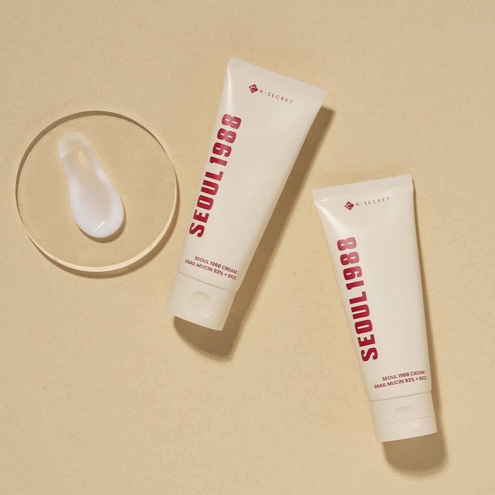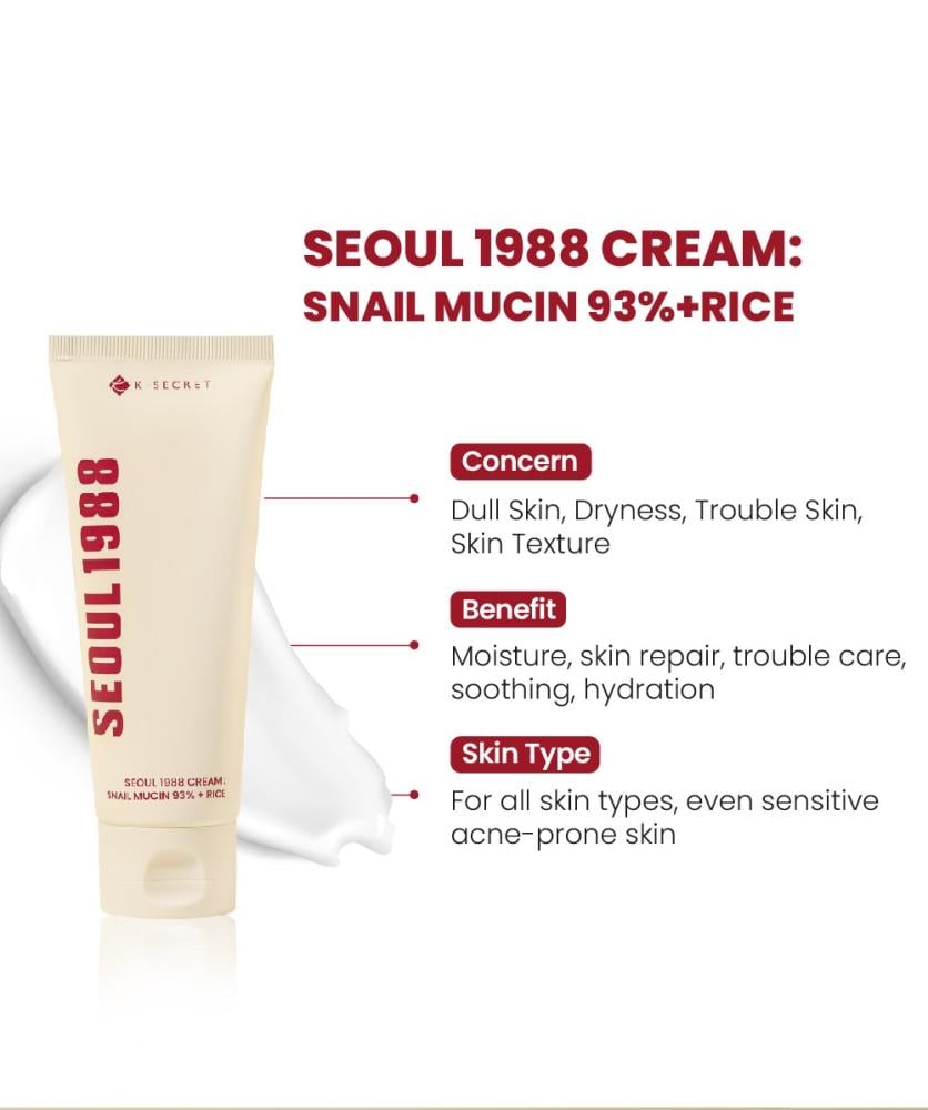 Begin your journey toward healthy, radiant skin with SEOUL 1988 Cream by K-SECRETA luxurious formula inspired by Korean beauty secrets, combining natural ingredients with advanced skincare technology.Key Ingredients:Snail Mucin (93%): A powerful active that supports cell regeneration, deeply hydrates the skin, and improves elasticity.Rice Extract: Brightens the complexion, evens out skin tone, and nourishes the skin with vitamins and minerals.Benefits & Features:Deep and long-lasting hydration without a greasy feel: Delivers lasting moisture, combats dryness, and leaves skin soft without stickiness or heaviness.Brightens and evens skin tone: Helps reduce pigmentation and dark spots for a more luminous, even complexion.Anti-aging care: Minimizes the appearance of fine lines and wrinkles while promoting skin elasticity and renewal, thanks to the high snail mucin content.Improves skin texture and refines pores: Smooths the skin's surface and visibly reduces pore size for a clearer, more refined look.Soothes sensitive and problem-prone skin: Calms redness and irritation with a gentle, skin-friendly formula—ideal for stressed or reactive skin.Boosts radiance and vitality: Enriches skin with active nutrients to reveal a fresher, more youthful glow.Lightweight and fast-absorbing: Perfect for daily use and under makeup, without clogging pores.Clean and safe formula: Free from harsh alcohols, synthetic fragrances, and artificial colorants.Suitable for all skin types: Works effectively on dry, oily, combination, and sensitive skin—especially beneficial for aging and mature skin.How to Use:After cleansing and applying toner and serum, apply an appropriate amount of cream to the face and neck as the final step in your skincare routine. Gently massage until fully absorbed.Make SEOUL 1988 Cream your go-to daily moisturizer and enjoy vibrant, healthy skin full of confidence and glow