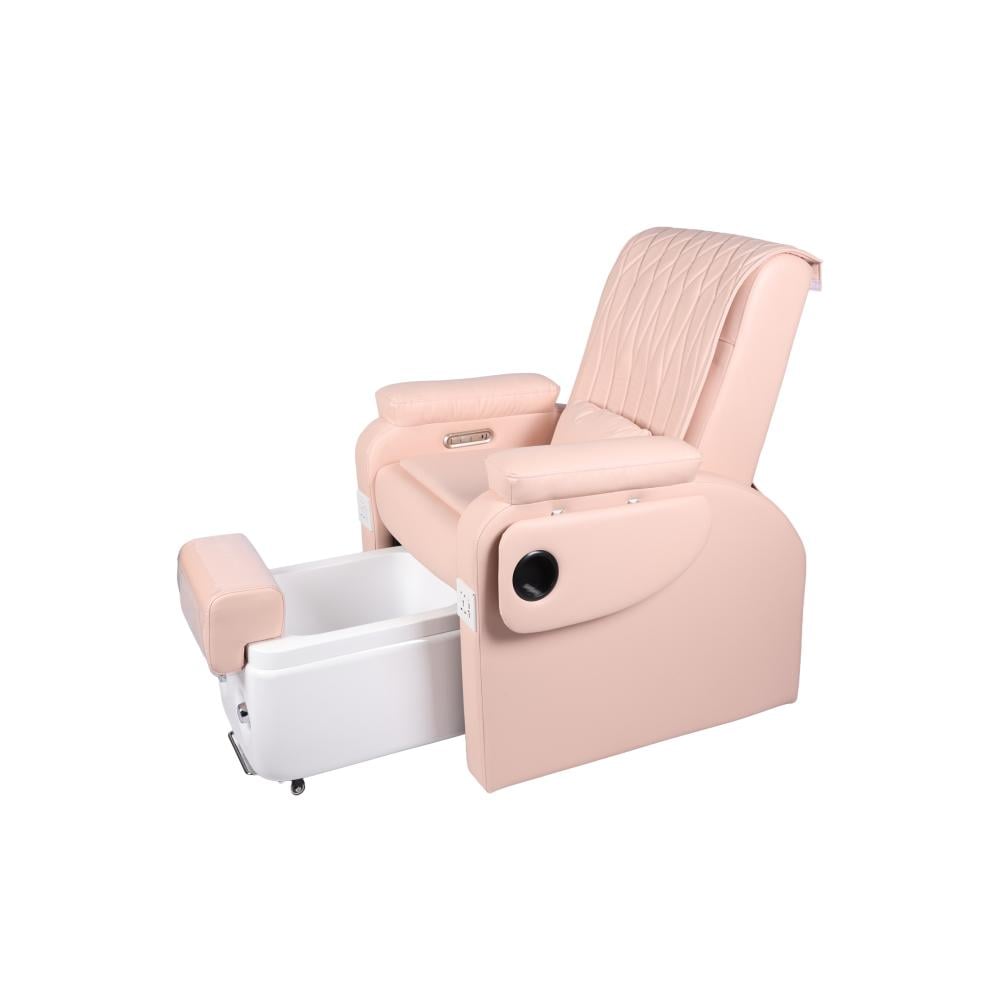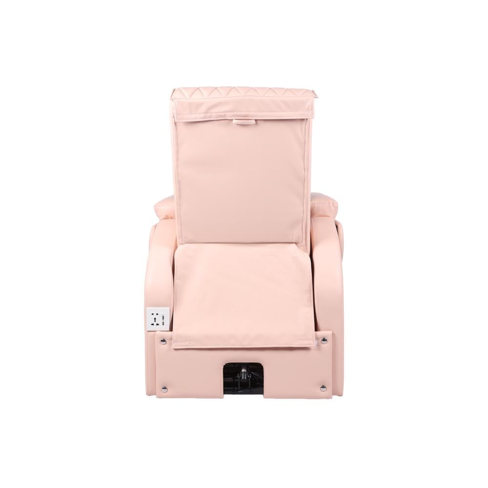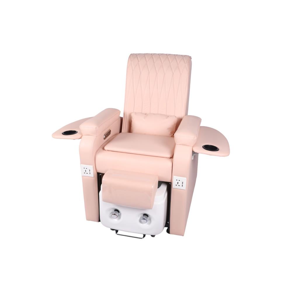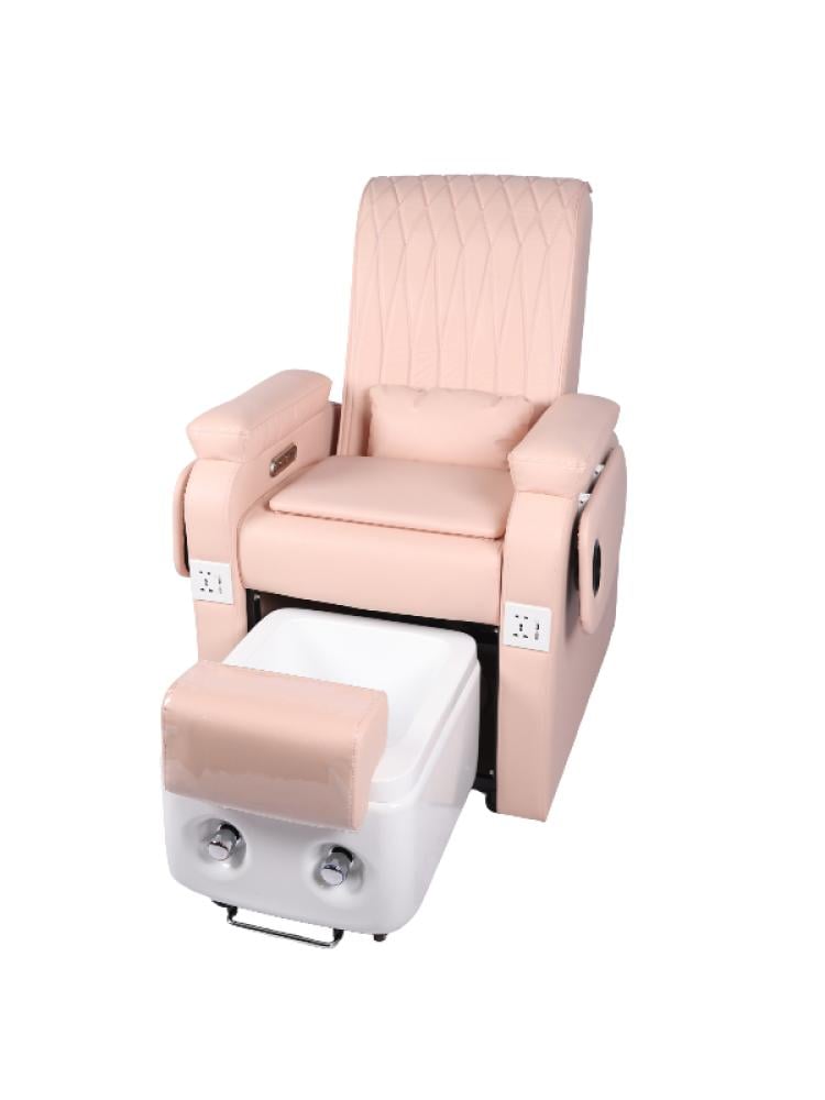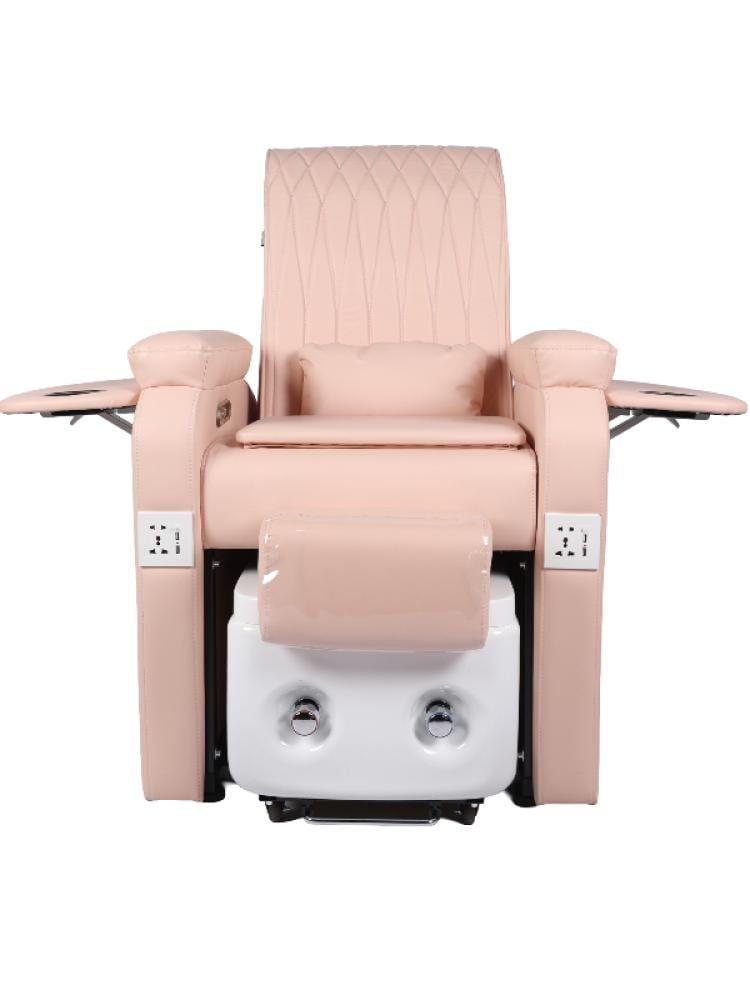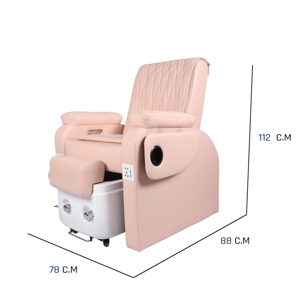 Give your clients an unforgettable pedicure and massage experience with the elegant pink massage chair from Salon System — designed with high quality to offer the perfect blend of comfort and practicality.Specifications:Type: Professional massage chair with a manually retractable pedicure tub equipped with wheels for easy mobility.Color: Light pink, adding a soft feminine touch and a refined look to your salon.Materials: Premium-quality upholstery with decorative stitching on the backrest, combining durability with easy maintenance.Control & Connectivity: Equipped with built-in power outlets and USB ports on both sides to offer a comfortable and modern client experience.Pedicure Tub: Elegant white, retractable, and easy to clean — ideal for foot care sessions.Dimensions:Length: 88 cmWidth: 78 cmHeight: 112 cmFeatures & Benefits:Exceptional Comfort: Cushioned design with a backrest and headrest for ideal support during long sessions.Practical Flexibility: Movable pedicure tub for easy use and cleaning.Built-in Ports: Power and USB ports for added convenience during treatments.Stylish Design: Soft pink color and modern detailing to match upscale salon interiors.High Quality: Made from durable materials to withstand frequent salon use.Multi-functional: Ideal for pedicures, manicures, and foot massages.Foldable Side Tables: Useful for placing tools or beverages during service.Complete your client care experience with the Salon System chair — a perfect blend of performance, comfort, and style.