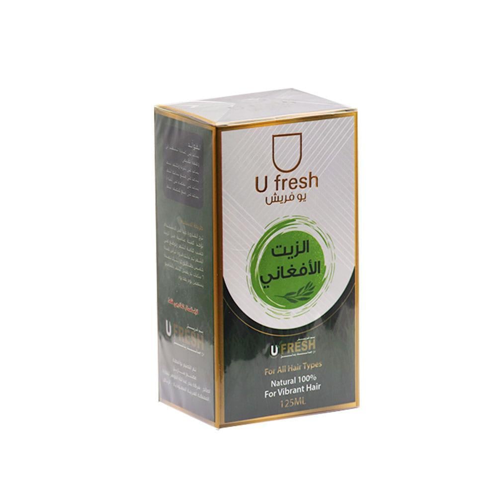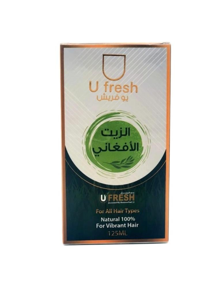 Give your hair authentic natural care with U Fresh Afghan Oil, a 100% pure formula suitable for all hair types, restoring its vitality and shine.Features & BenefitsSuitable for all hair types: dry, damaged, or normal.100% natural formula, free from harmful chemicals.Nourishes the scalp and strengthens hair follicles from the roots.Helps reduce hair loss and promotes healthy growth.Provides deep hydration and long-lasting natural shine.Protects hair from external factors while reducing split ends and breakage.Revives hair’s vitality, leaving it softer and smoother.Choose U Fresh Afghan Oil – 125ml as your perfect companion for hair care, and start your day with stronger, healthier, and more beautiful strands.