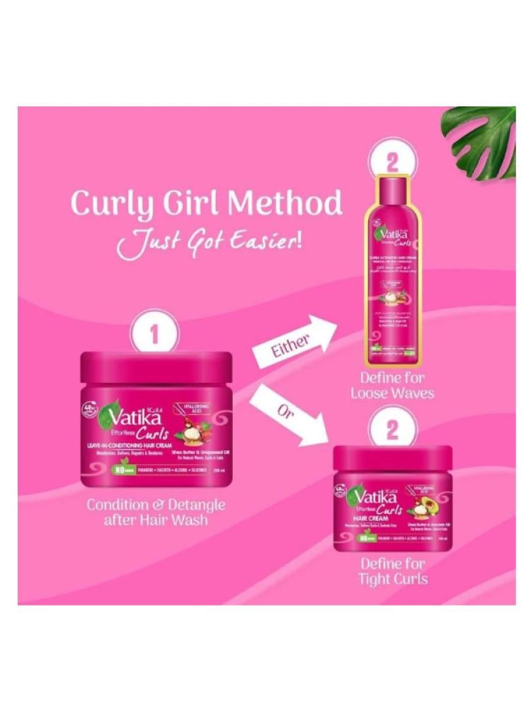This is the Vatika Leave-in Smoothing Hair Cream for Curls – in a 300 ml!Features:Deep Hydration: Deeply moisturizes curly hair and makes it softer.Detangling: Helps to detangle hair and facilitate styling.Curl Definition: Gives curls an organized and natural look that lasts all day.Frizz Control: Reduces hair frizz (flyaways) and maintains the curl shape.Nourishment and Protection: Nourishes the hair and protects it from dryness and external factors.How to Use:Apply an appropriate amount of the cream to clean, damp hair.Distribute it evenly from roots to ends.Do not rinse (Leave-in), and let the hair air dry naturally or dry it using a diffuser attachment on a hairdryer to maintain the curl shape.